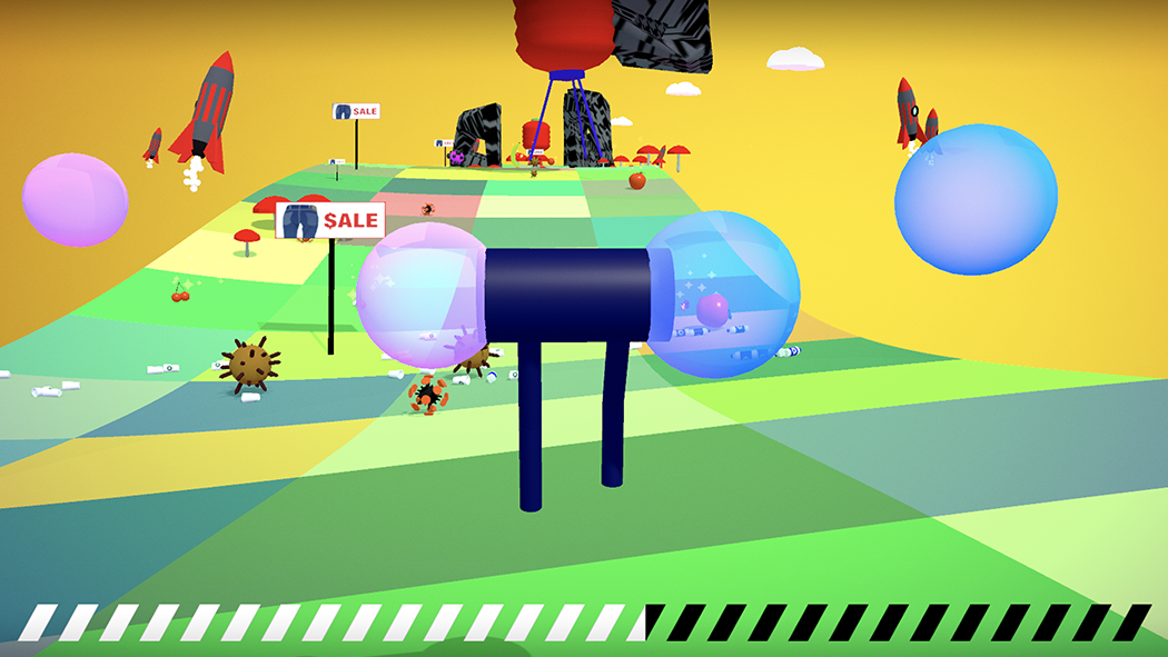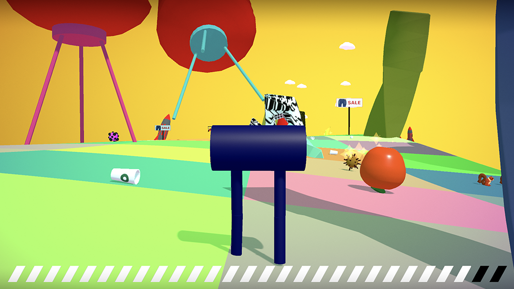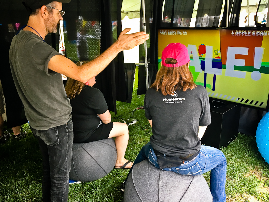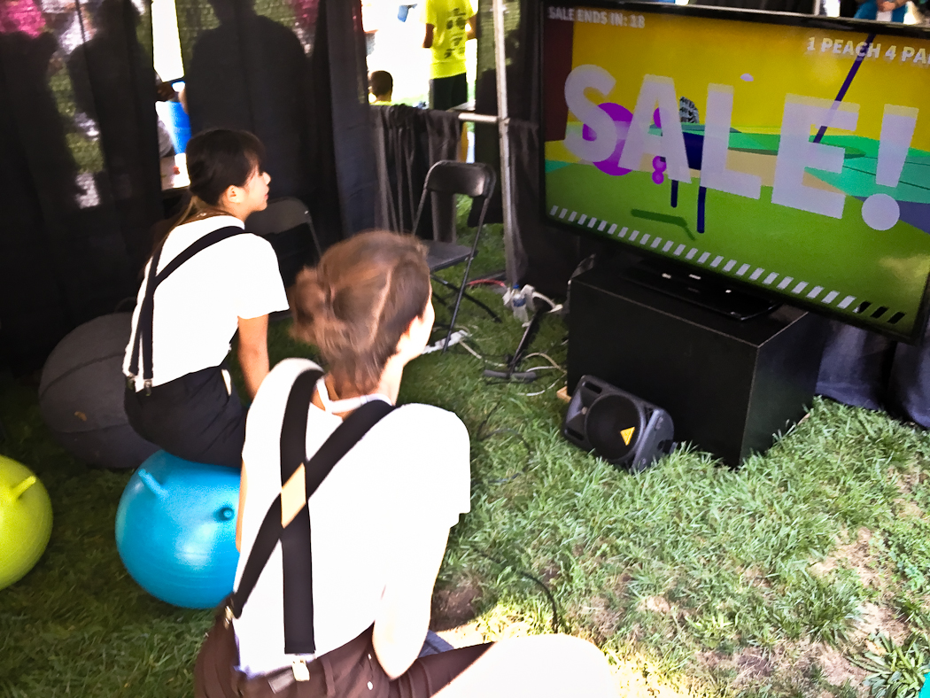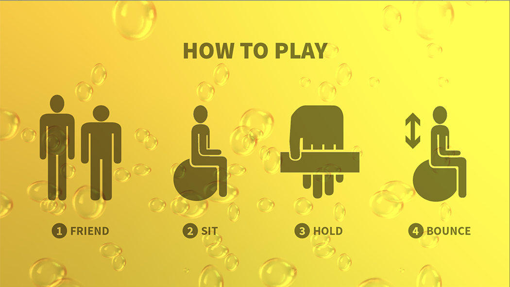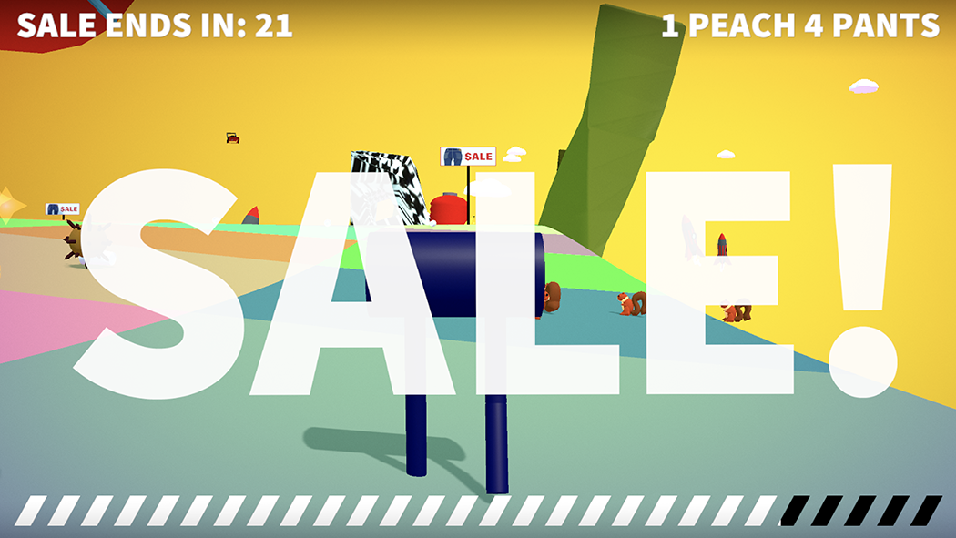 A collaborative video game installation for use with yoga balls. Players work together to control a sentient pair of pants by bouncing. The pants move through the landscape in search of sales and new fashions.