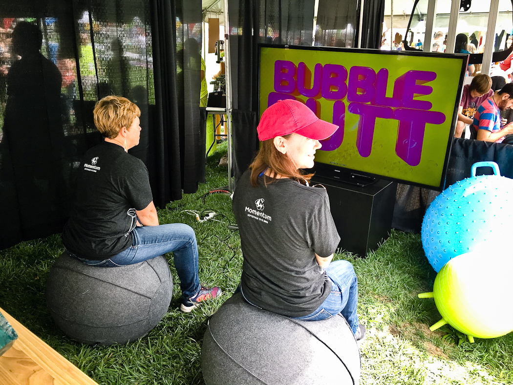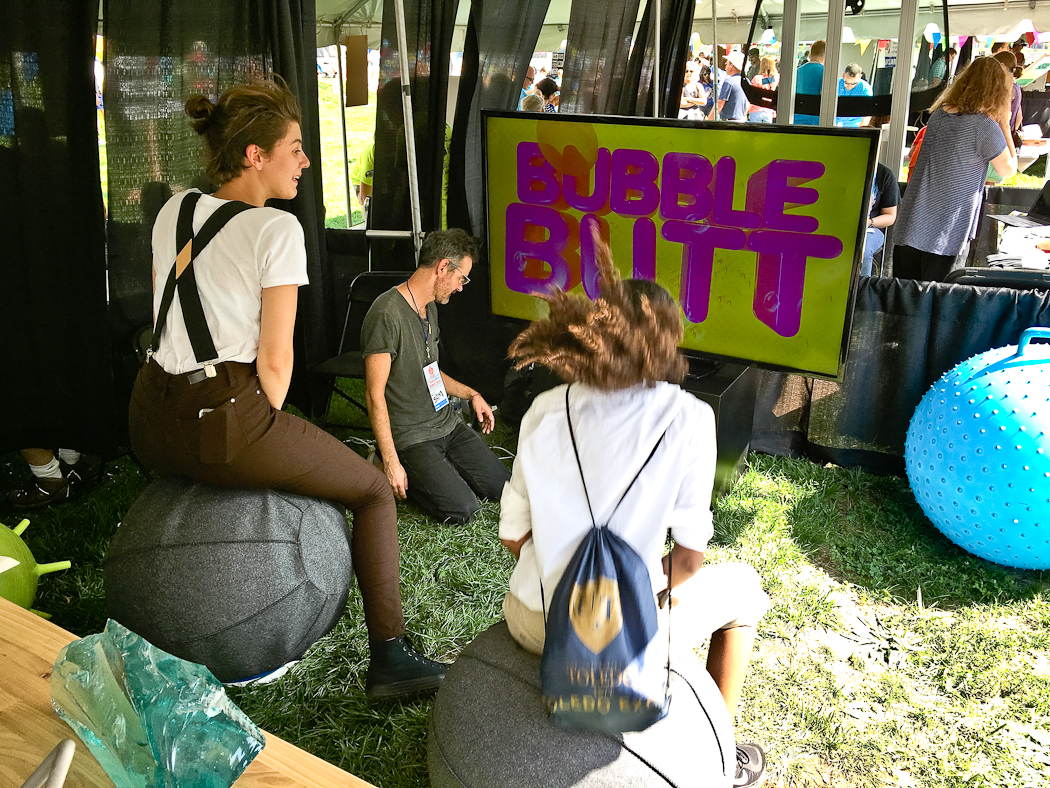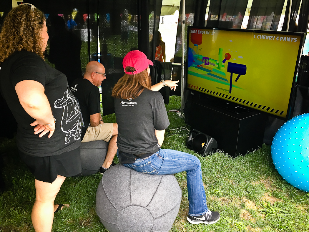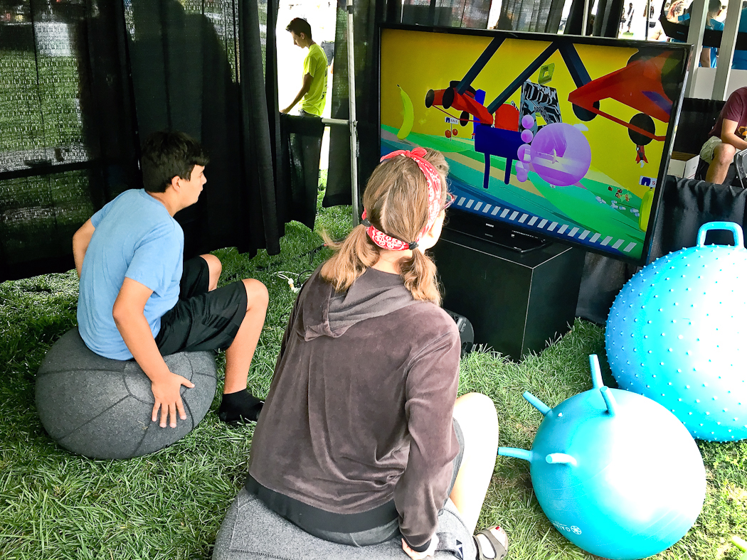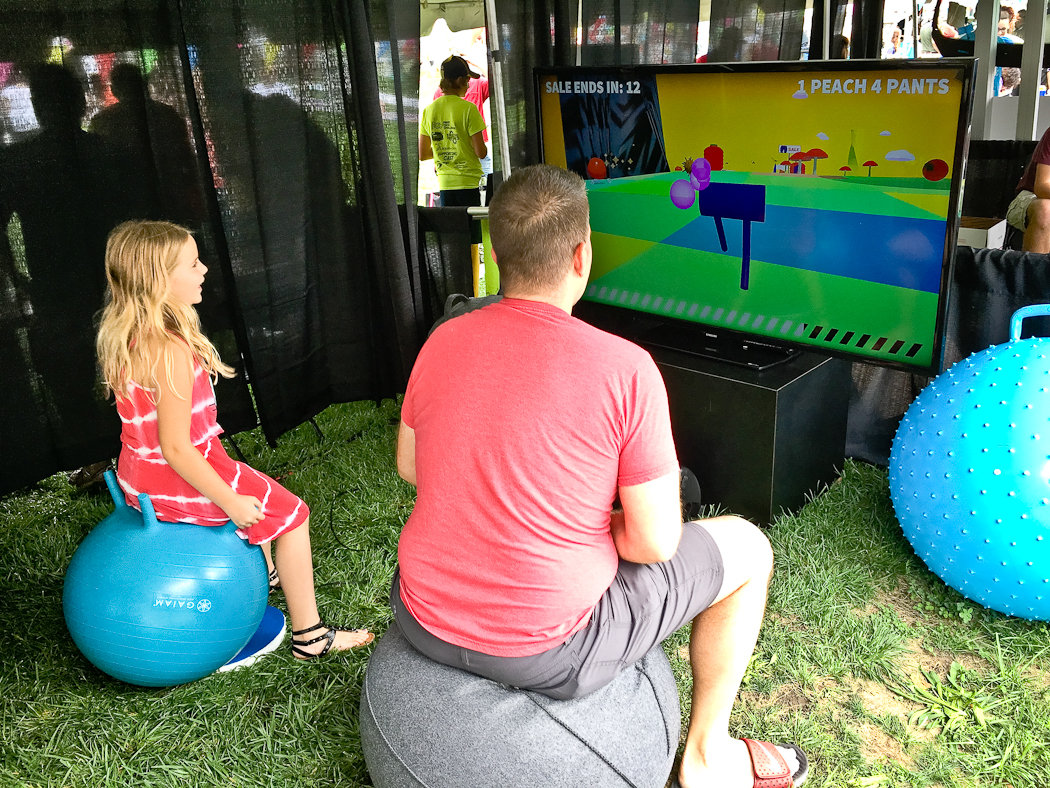 A collaborative video game installation for use with yoga balls. Players work together to control a sentient pair of pants by bouncing. The pants move through the landscape in search of sales and new fashions.