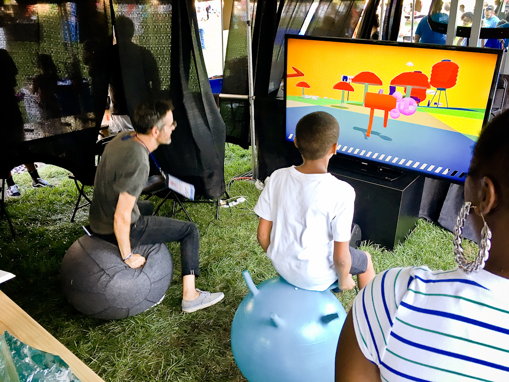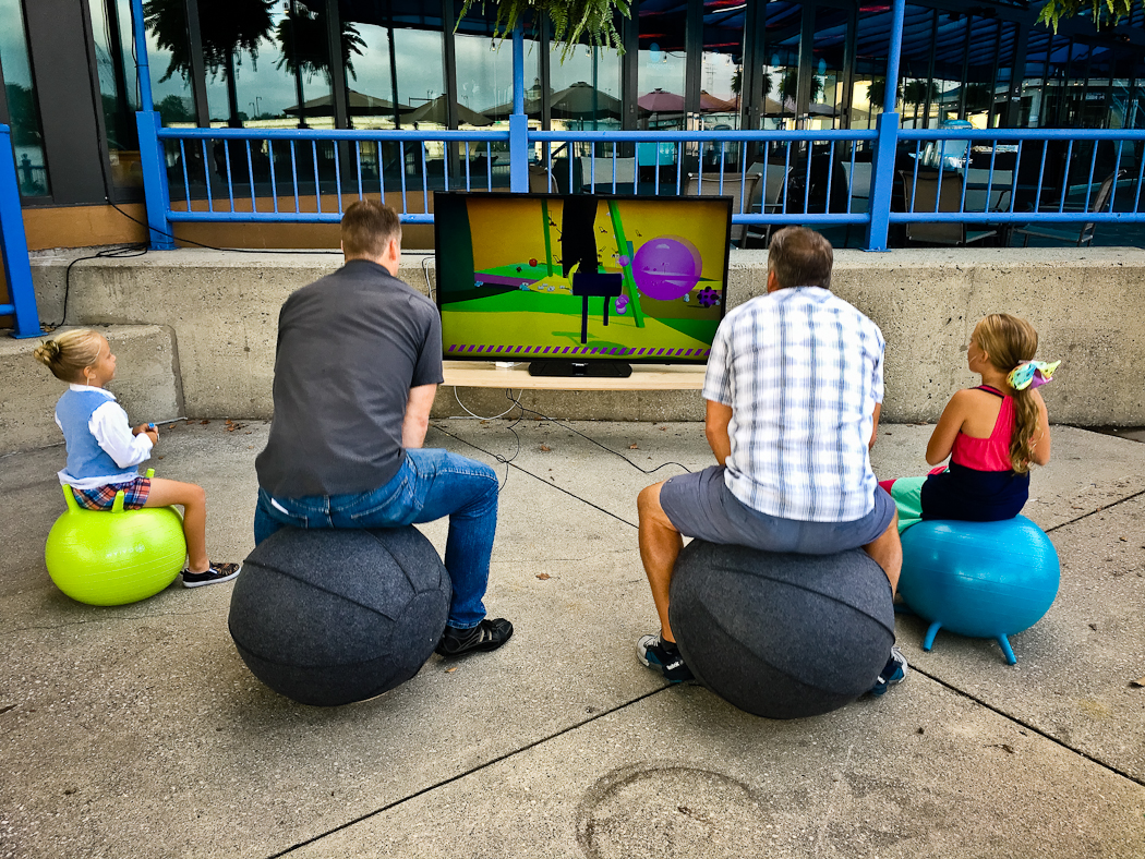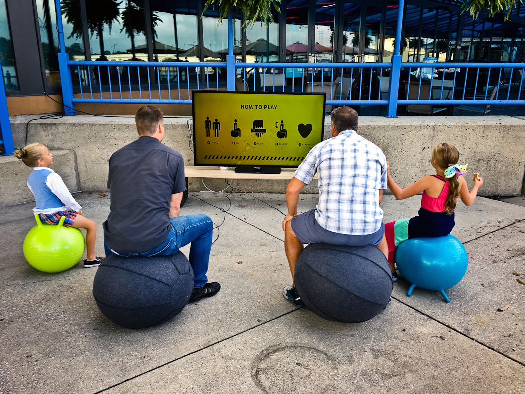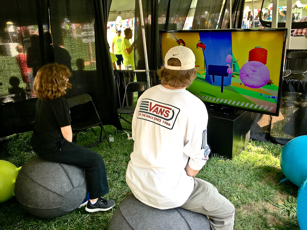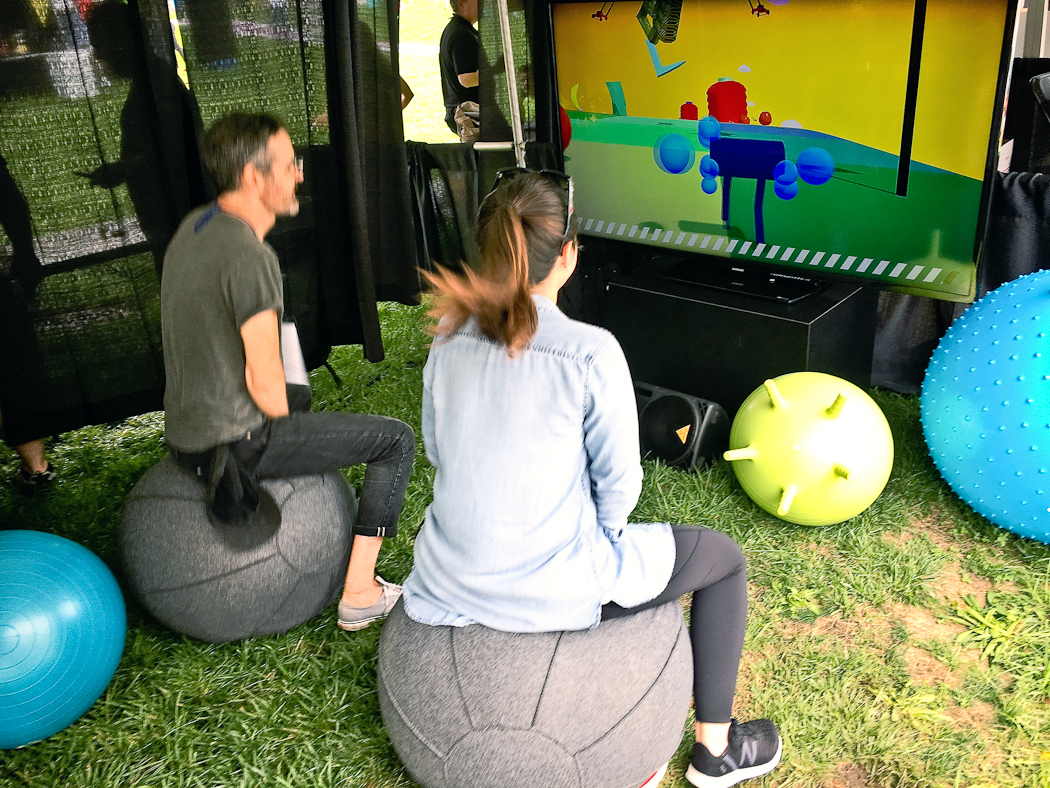 A collaborative video game installation for use with yoga balls. Players work together to control a sentient pair of pants by bouncing. The pants move through the landscape in search of sales and new fashions.
